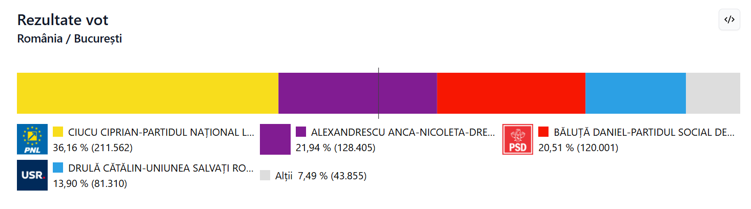 Potrivit exit-poll-ului prezentat la ora 21.00, Ciprian Ciucu se află pe primul loc în cursa pentru Primăria Capitalei, cu un avans considerabil față de ceilalți candidați. Rezultatele oficiale urmează să fie anunțate de Biroul Electoral Municipal.