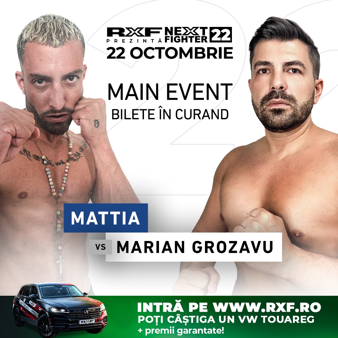 🔔 Notează în calendar: RXF Next Fighter 22, pe 22 octombrie, cu Marian Grozavu vs Mattia Carnessali în Main Event. Biletele vor fi puse în curând în vânzare, iar atmosfera se anunță incendiară.