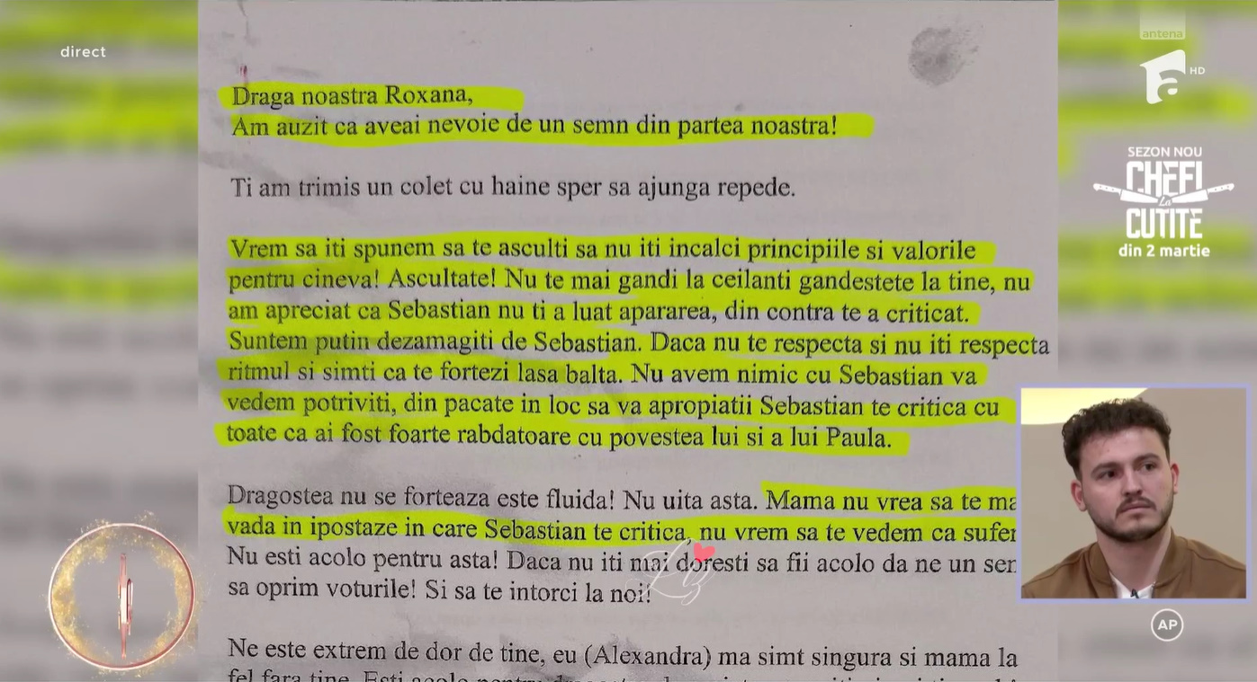 În rândurile trimise de cei dragi, familia i-a transmis Roxanei să își asculte inima, să nu își încalce principiile și valorile pentru nimeni și să se pună pe primul loc. Mai mult decât atât, apropiații au mărturisit că sunt dezamăgiți de atitudinea lui Sebastian, considerând că acesta nu i-a oferit suficientă susținere și, din contră, a criticat-o în anumite momente.